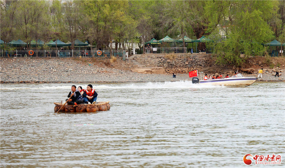 r黄河岸畔,羊皮筏子载着游人破浪前行,筏工持桨掌舵,在黄河浪涛中穿梭。一旁快艇疾驰而过,扬起阵阵水花,红旗飘扬间尽显黄河风情。市民们乘筏渡河,近距离感受黄河的雄浑壮阔,体验“筏子客”的独特乐趣。