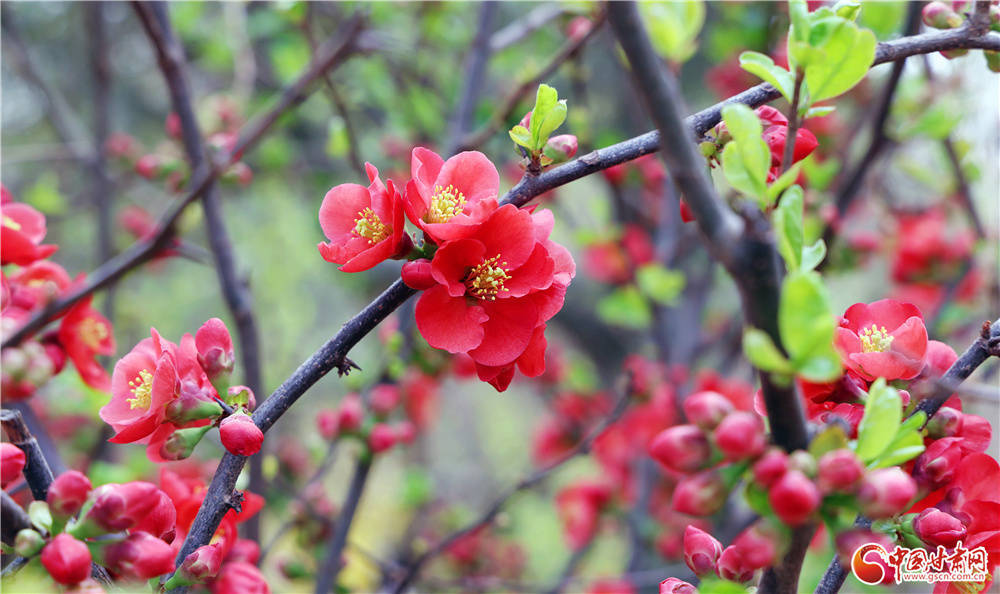 r贴梗海棠热烈绽放,艳红的花朵缀满枝头,与嫩绿新叶相映成趣,引得游人驻足观赏、拍照打卡。
